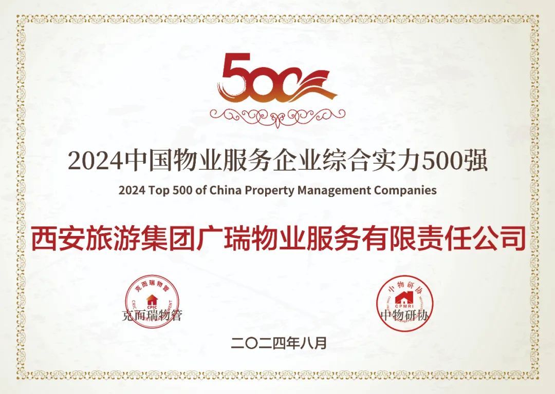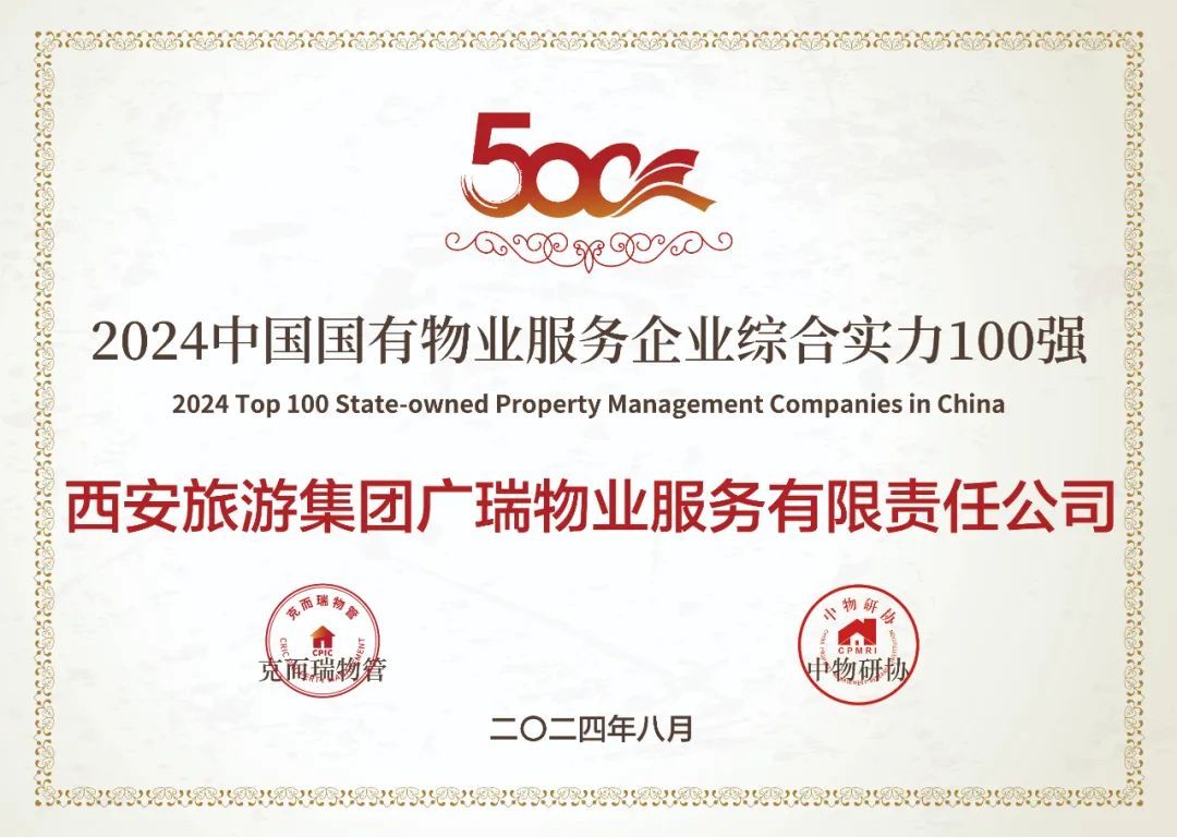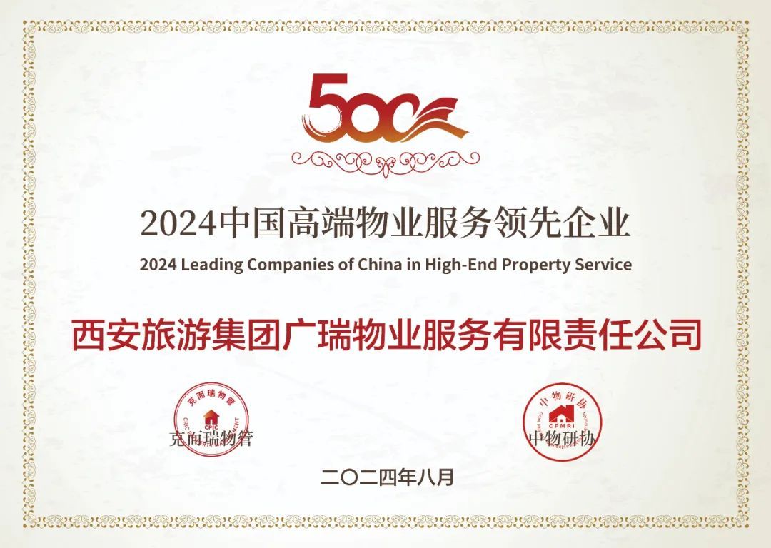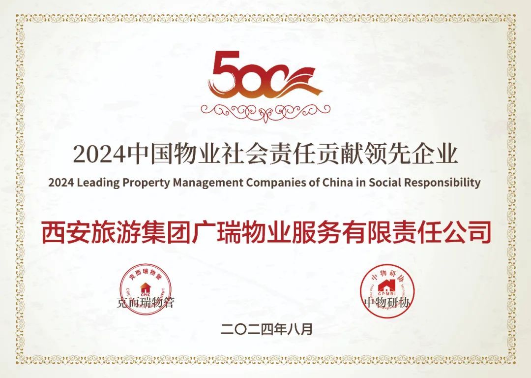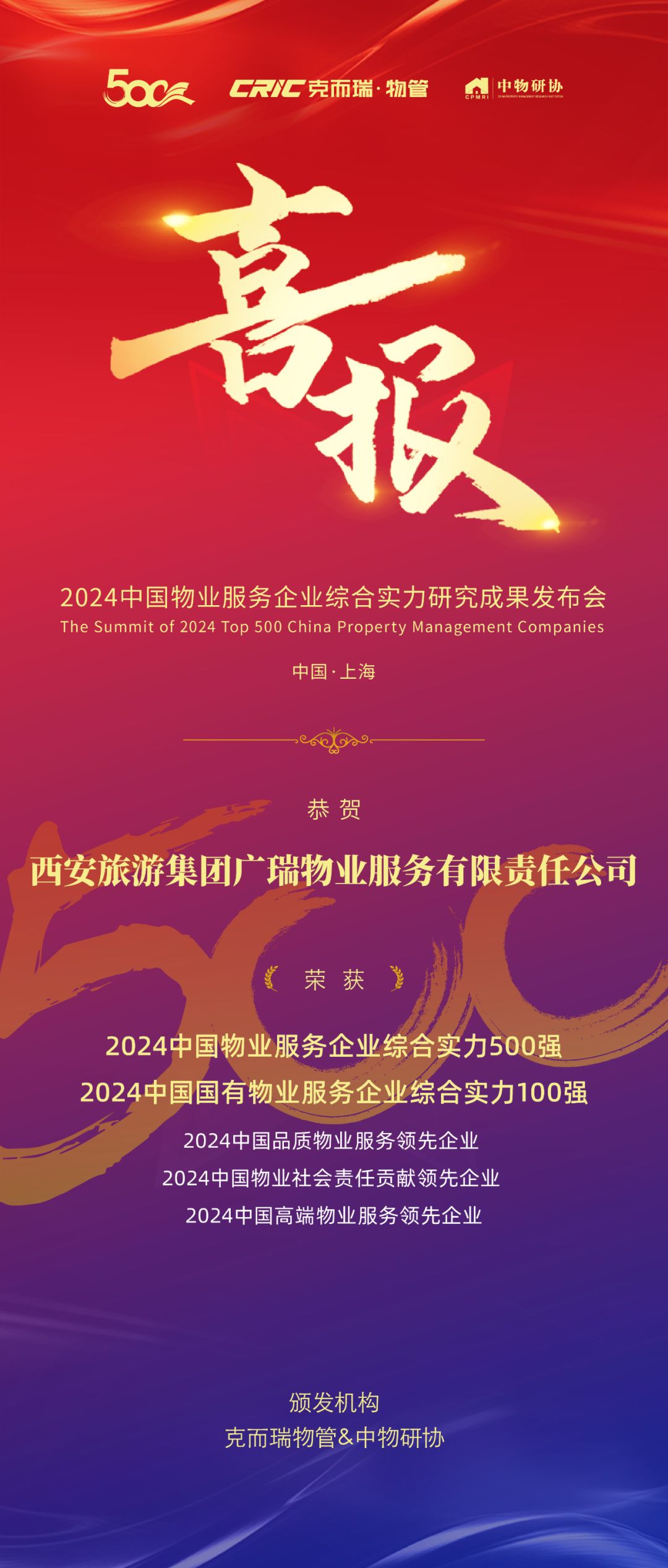 在「2024中國(guó)物業(yè)服務(wù)企業(yè)綜合實(shí)力研究成果」中,西安旅游集團(tuán)廣瑞物業(yè)服務(wù)有限責(zé)任公司榮獲“2024中國(guó)物業(yè)服務(wù)企業(yè)綜合實(shí)力500強(qiáng)”、“2024中國(guó)國(guó)有物業(yè)服務(wù)企業(yè)綜合實(shí)力100強(qiáng)”、“2024中國(guó)品質(zhì)物業(yè)服務(wù)領(lǐng)先企業(yè)”、“2024中國(guó)物業(yè)社會(huì)責(zé)任貢獻(xiàn)領(lǐng)先企業(yè)”、“2024中國(guó)高端物業(yè)服務(wù)領(lǐng)先企業(yè)”獎(jiǎng)項(xiàng)。