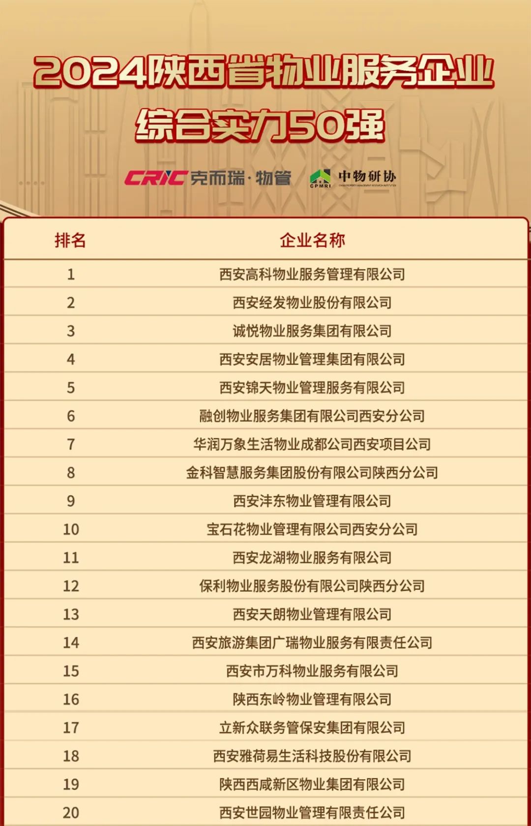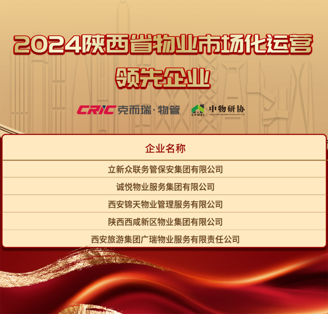 2025年1月3日,克而瑞物管與中物研協(xié)聯(lián)合發(fā)布「2024陜西省物業(yè)管理行業(yè)綜合實(shí)力測評成果」。同期揭曉了“2024年陜西省物業(yè)服務(wù)企業(yè)綜合實(shí)力50強(qiáng)”以及各細(xì)分領(lǐng)域榜單,為陜西省物業(yè)服務(wù)力樹立了風(fēng)向標(biāo)。